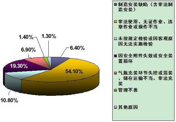按照事故原因分析,制造安裝缺陷(含非法制造安裝)占6.4%,非法使用、無證作業(yè)、違章作業(yè)或操作不當(dāng)占54.1%,未按規(guī)定檢驗(yàn)或因客觀原因無法實(shí)施檢驗(yàn)占10.6%,因安全附件失效或安全裝置損壞占19.3%,氣瓶充裝環(huán)節(jié)失控或混裝、儲(chǔ)存運(yùn)輸不當(dāng)、非法充裝占6.9%,管理不善占1.4%,其他原因的占1.3%。