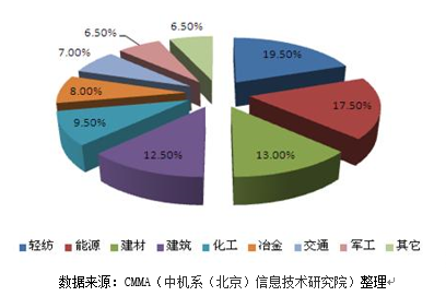 工業鍋爐50%以上用于各主要工業部門。根據初步的調查統計,在我國工業生產中需要大量用熱的部門,主要是輕紡和化學工業,其用熱溫區和用量比例,和美國1977年對全國工業用熱的調查估計大體一致,工業用熱的參數范圍大約在300℃和1.0MPa以下。未來輕紡工業、能源工業、建材、建筑業、化學工業、冶金工業、交通運輸業和軍工部門等仍將是工業鍋爐的主要市場,各自所占份額見圖7。