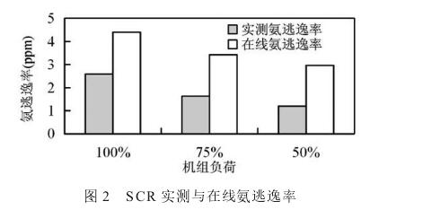 氨逃逸率隨著負荷的下降而下降。在100%負荷條件下,氨逃逸率最高,為2.7ppm(標態(tài),干基,15%O2,下同),而從在線顯示值來看,SCR反應器的氨逃逸率較高,為4.6ppm,與實際測量值偏差較大。在75%和50%負荷條件下,均存在這種情況。說明在線數(shù)據(jù)并不可信,應定期對在線儀器進行校正。