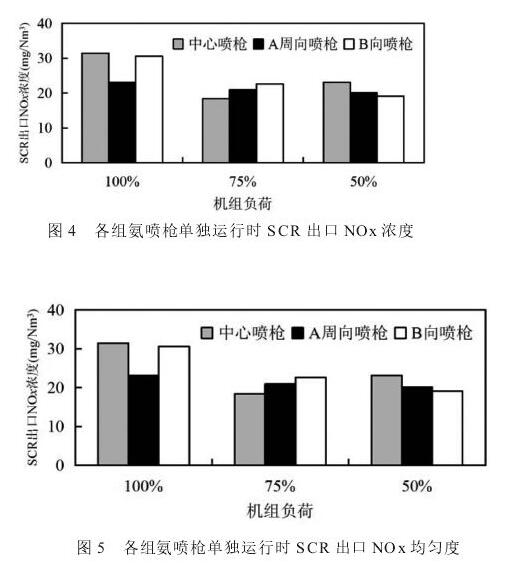 (2)只運行A周向噴槍,NOx的均勻度相對較好。高負荷下要控制較低NOx排放濃度,建議3組周向噴槍同時啟用。