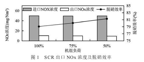 在不同的負荷條件下,脫硝效率均能保持在80%左右,并沒有出現(xiàn)由于負荷的大幅度變化而導致的脫硝效率大幅度波動,出口NOx濃度均能保持在10mg/Nm3左右,表明SCR對負荷的變化不敏感。