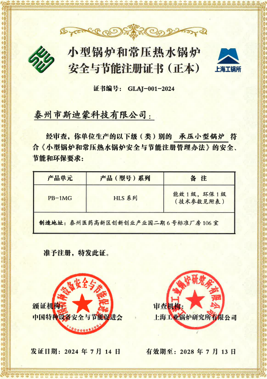 為合理評價小型鍋爐和常壓熱水鍋爐安全、節能和環保性能,促進此類產品結構優化和技術進步,由中國特種設備安全與節能促進會和上海工業鍋爐研究所有限公司共同發起組織了小型鍋爐和常壓熱水鍋爐安全與節能注冊工作。由企業自愿申請,并經專家組現場審查,斯迪蒙科技有限公司成為第一家獲得小型鍋爐和常壓熱水鍋爐安全與節能注冊認證的企業。